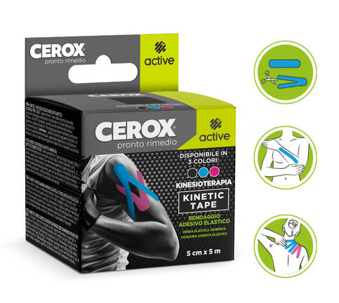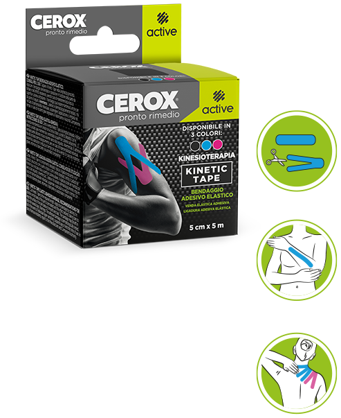 Cerox® Active Kinetic-Tape può accorciare il tempo di recupero e aumentare i livelli di forma fisica. Agisce anche più in superficie, a partire dal derma, riducendo la pressione interstiziale della zona infiammata sottostante. Favorisce il drenaggio linfatico. Non stringe, lascia liberi i movimenti. Può essere utilizzato come ausilio al processo di guarigione nella riabilitazione e nella medicina sportiva.